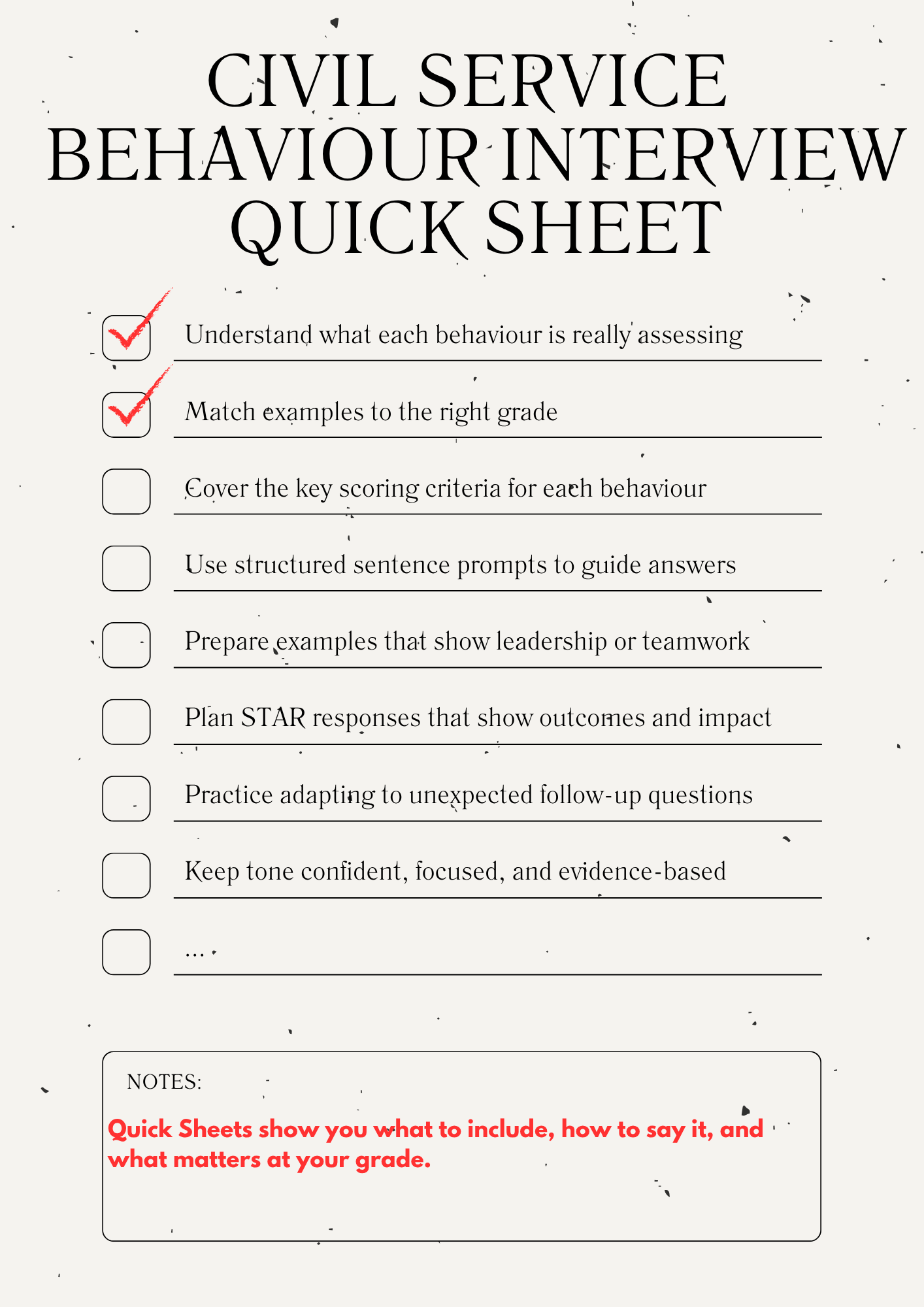 Civil Service interviews are scored against specific behaviour markers. This sheet shows you exactly what to cover – no guesswork. Use it to build your answers, rehearse them, or keep it on hand during the interview itself for quick mental checks.