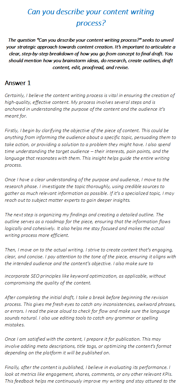 1️⃣ "Can you describe your content writing process?": This question seeks to understand how you manage your tasks and organize your work.