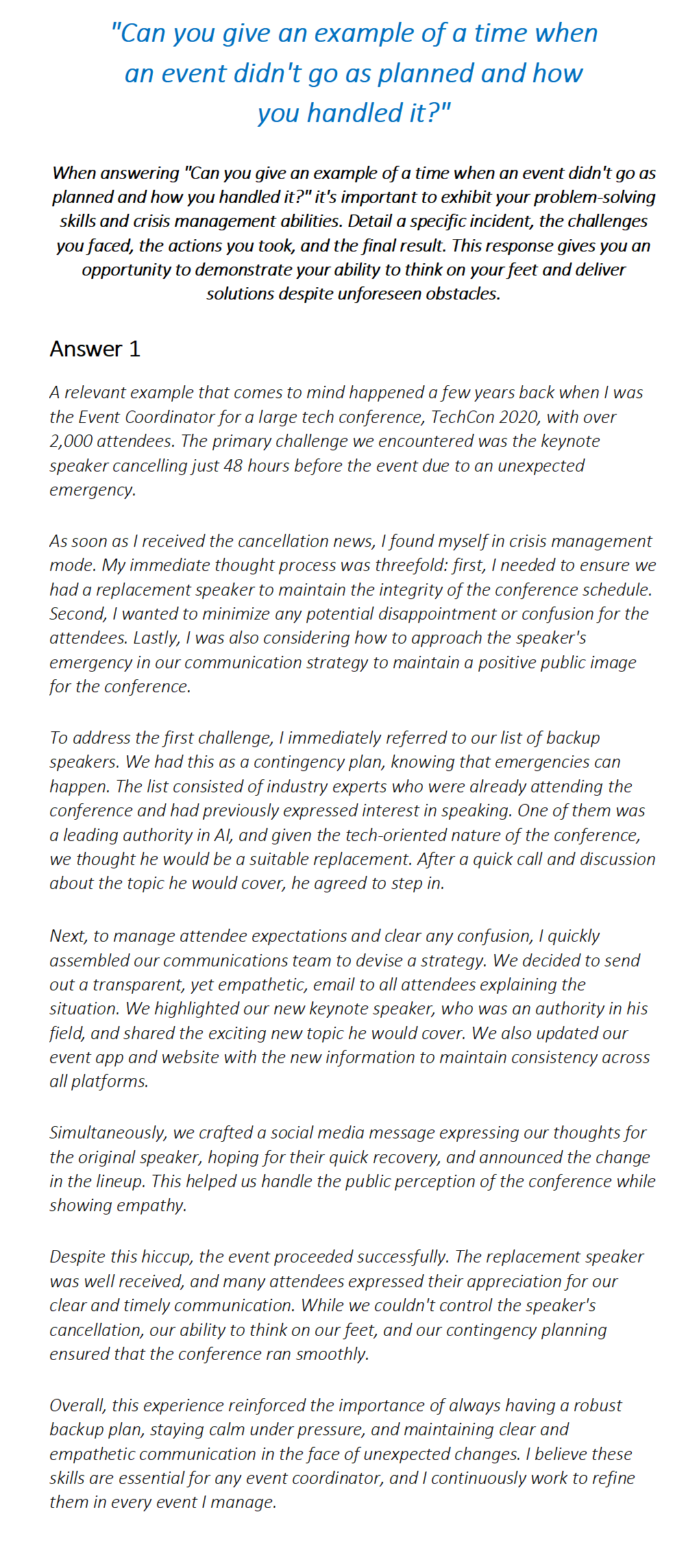 5️⃣ "Can you give an example of a time when an event didn't go as planned and how you handled it?" Real-life examples of how you manage challenges provide concrete proof of your skills in action.