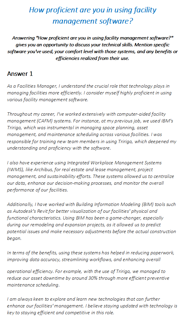"Why are you interested in this position and what do you hope to accomplish as a Facilities Manager here?" Your motivations and aspirations reveal your commitment and vision for the role, indicating your potential success in the position.