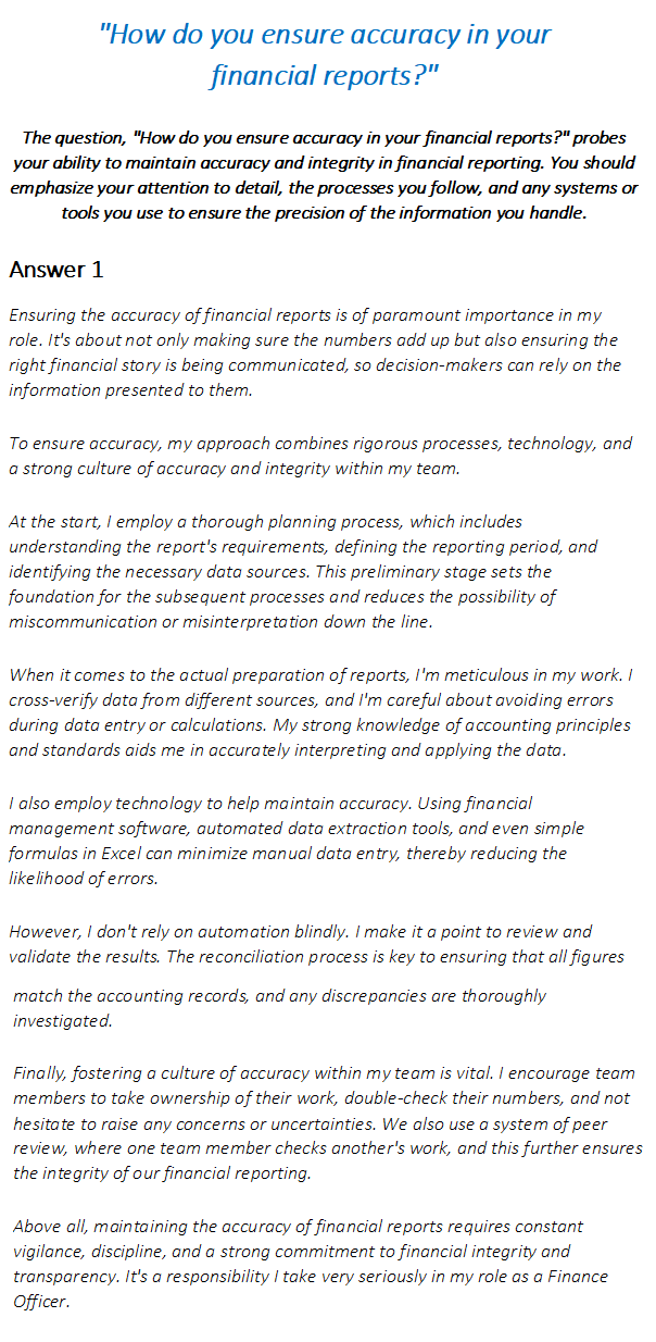 🔎 "How do you ensure accuracy in your financial reports?" – Here you can showcase your commitment to excellence and the processes you follow to maintain high standards.