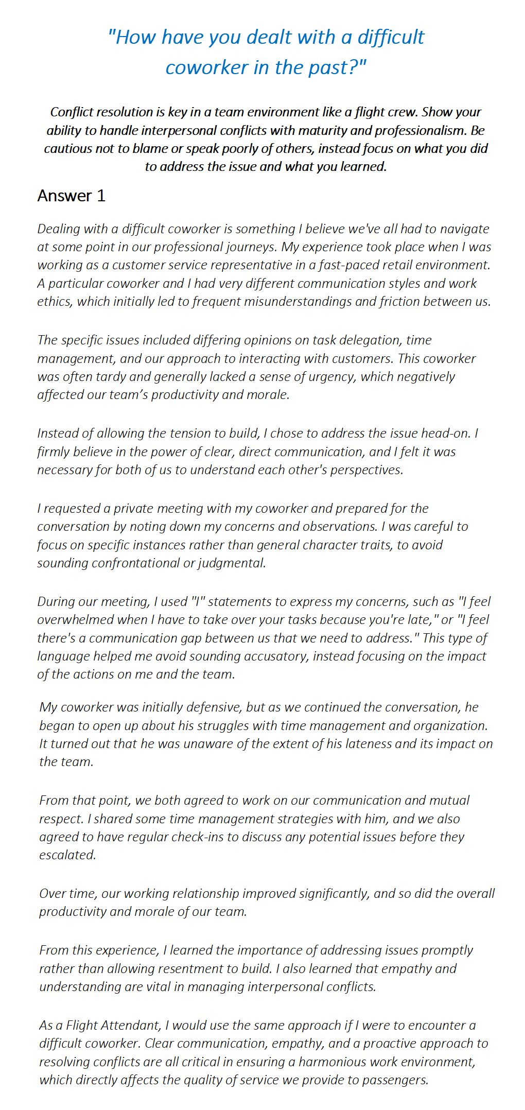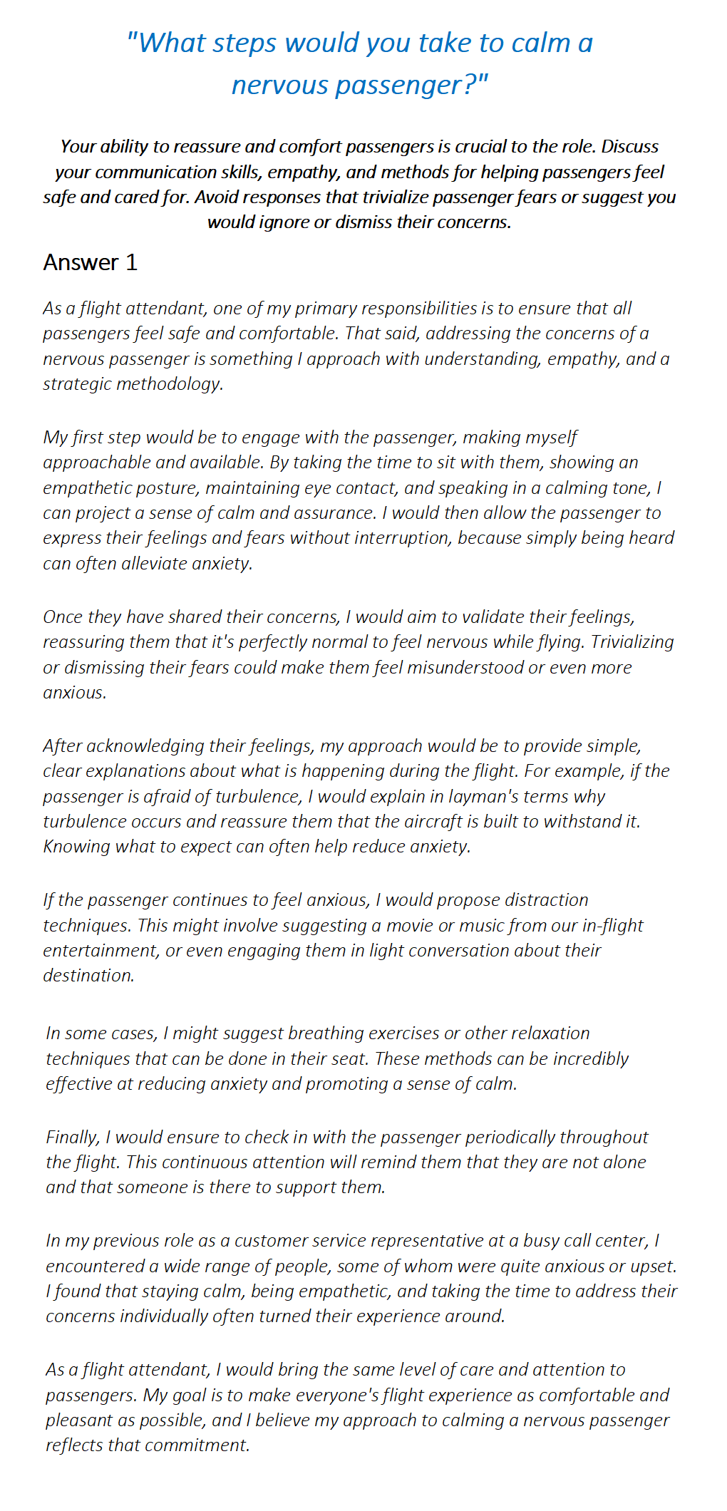 Here are five sample questions from our guide, which provide a glimpse of the types of questions you'll encounter during your flight attendant interview: