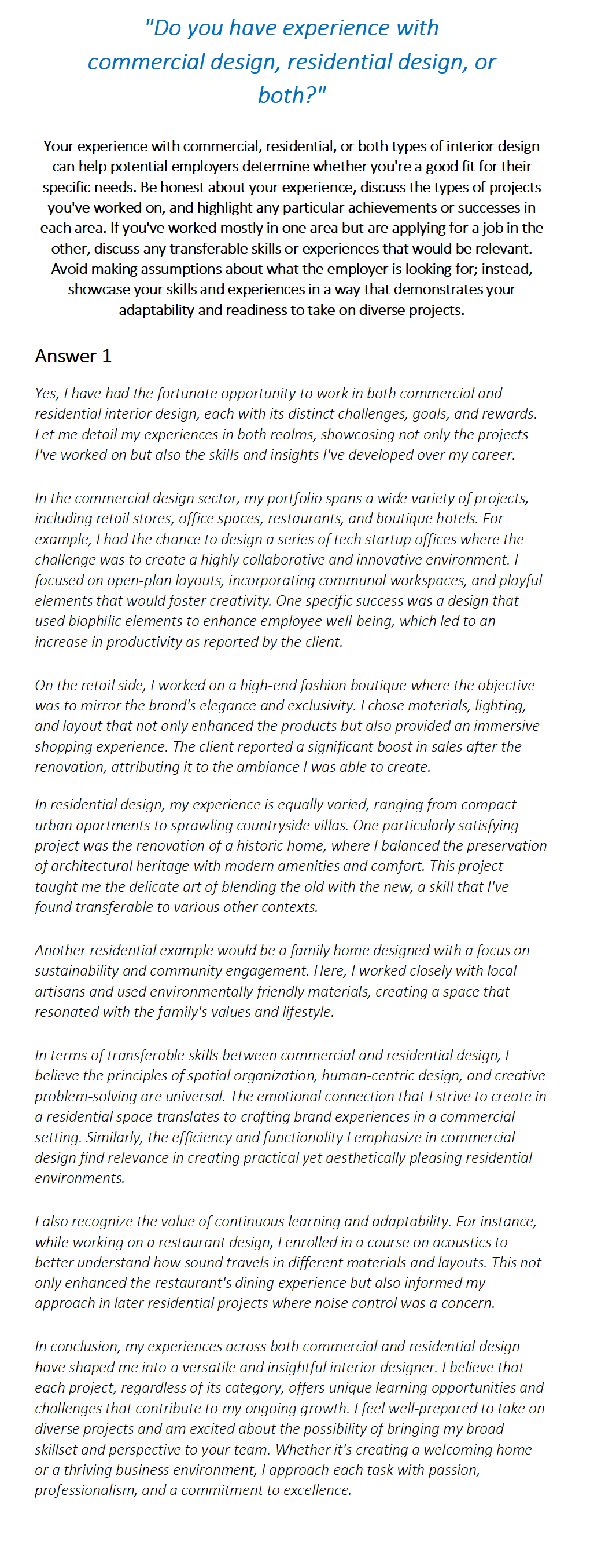 ✅ Interview Questions & Sample Answers - Overcome nervousness with over 100 sample answers to the most commonly asked interview questions in the interior design field.