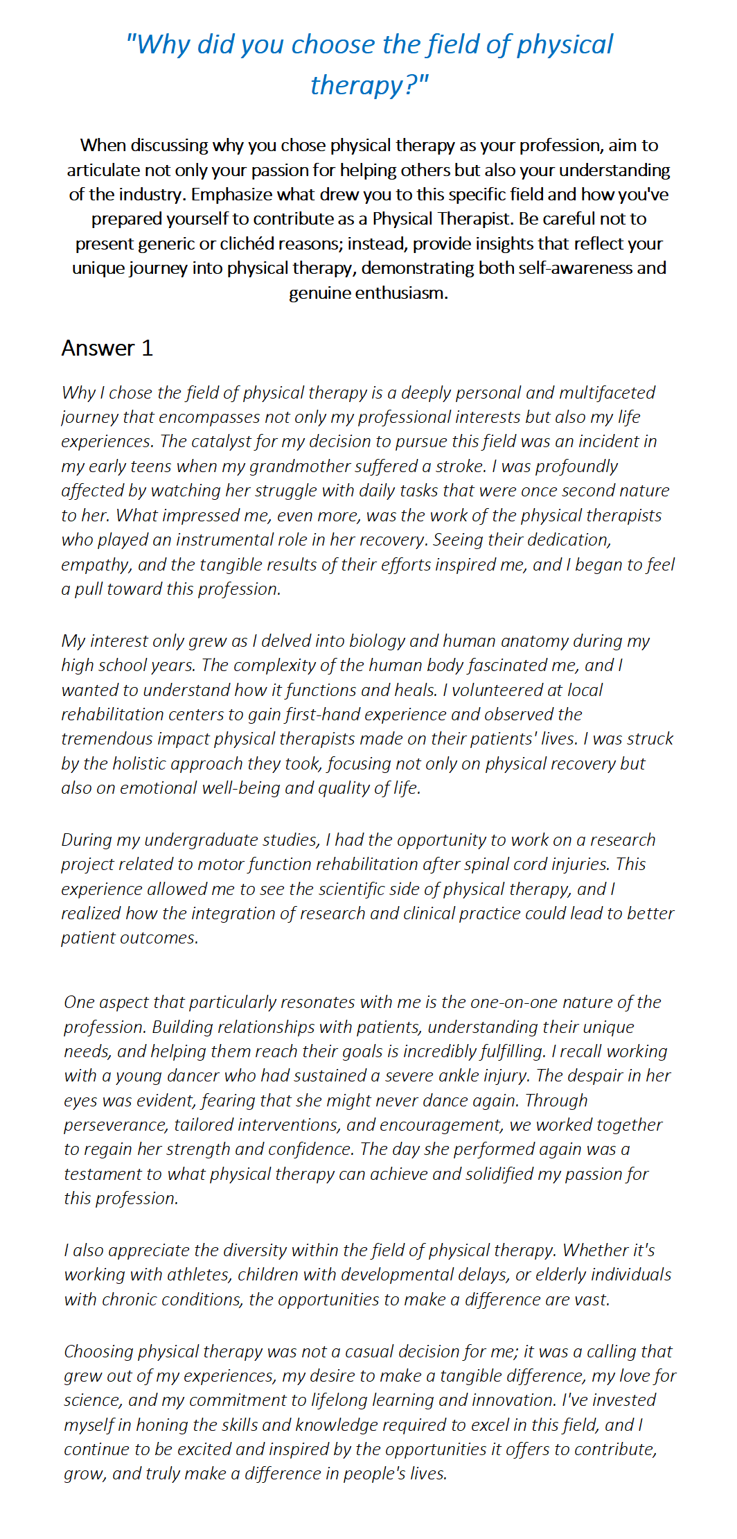 🔍 "Why did you choose the field of physical therapy?": Understanding your motivation is vital. This question helps the interviewer gauge your passion and commitment to the field. It's not just about choosing a career; it's about aligning with a mission to improve people's lives. Your answer can reveal your dedication and personal connection to physical therapy.